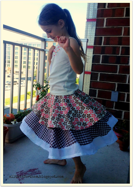 I worried that that the skirt wasn't going to be long enough (I shouldn't have worried!), and added an extra band of white fabric. I hemmed the flower fabric and then hemmed the white band after Clara tried on the skirt.