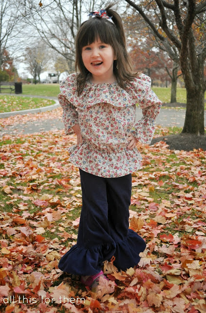 And then there are the pants. Aren't they the coolest? I love that ankle ruffle. I used a royal blue pinwale corduroy and the fabric worked great for this project. I just love the texture both for its visual appeal and for its soft touch.